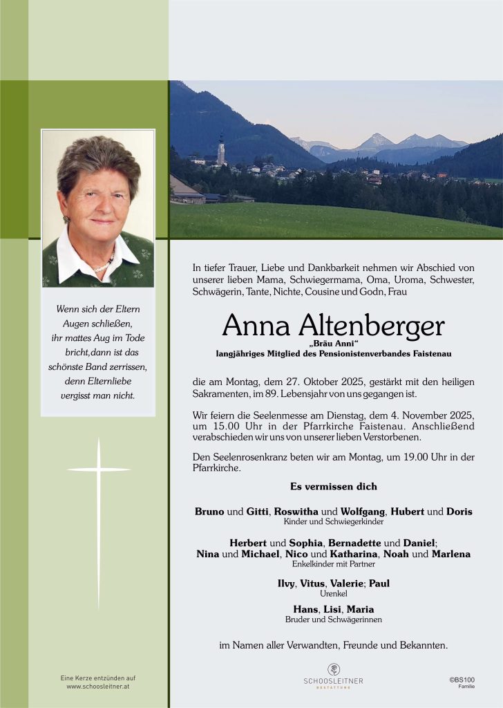 Neuer Eintrag in das Kondolenzbuch von Frau Anna Altenberger