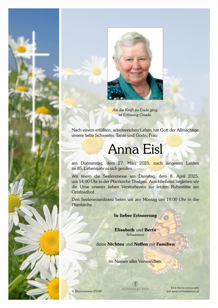 Neuer Eintrag in das Kondolenzbuch von Frau Anna Eisl