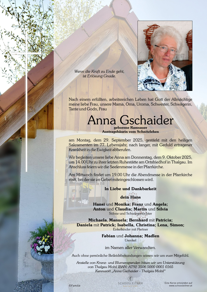 Neuer Eintrag in das Kondolenzbuch von Frau Anna Gschaider