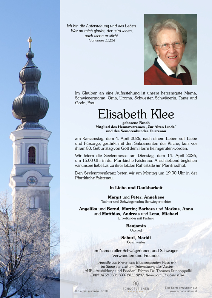 Anstelle von Kranz- und Blumenspenden bitten wir im Sinne von Lisi um Unterstützung