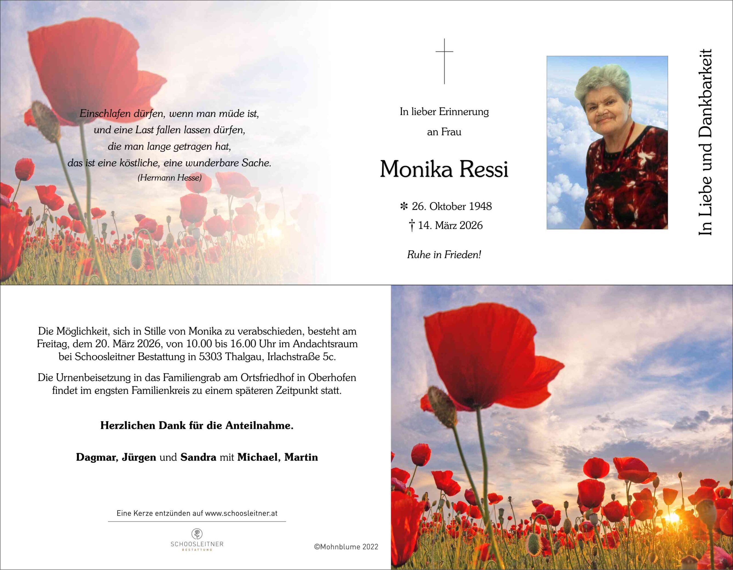 Die Möglichkeit, sich in Stille von Monika zu verabschieden, besteht am Freitag, dem 20. März 2026, von 10.00 bis 16.00 Uhr im Andachtsraum bei Schoosleitner Bestattung in 5303 Thalgau, Irlachstraße 5c.