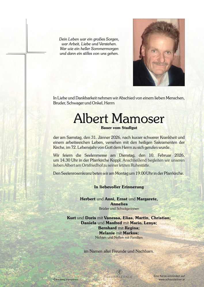Neuer Eintrag in das Kondolenzbuch von Herr Albert Mamoser