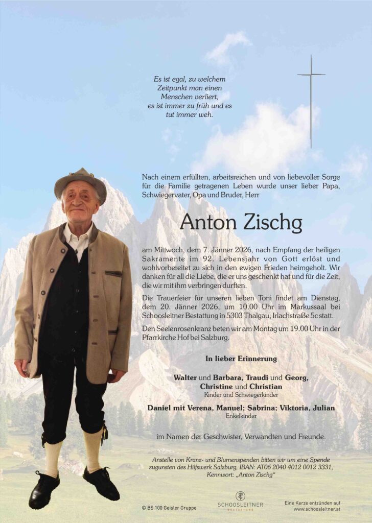 Neuer Eintrag in das Kondolenzbuch von Herr Anton Zischg