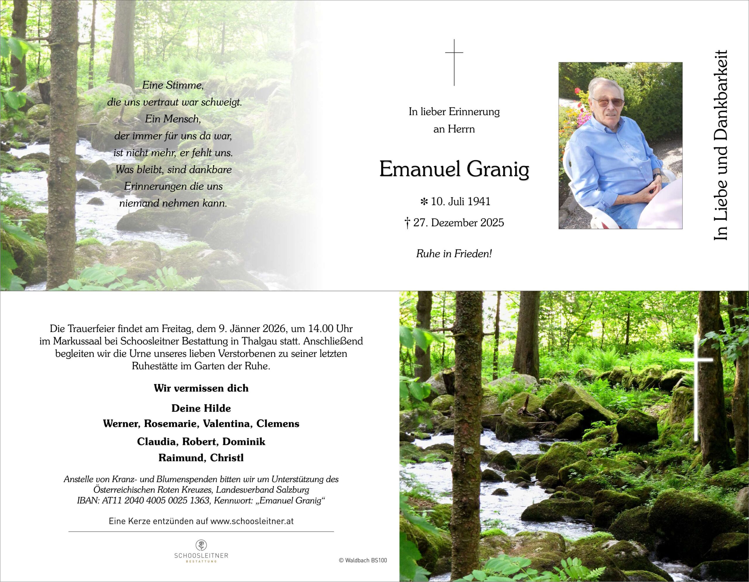 Anstelle von Kranz- und Blumenspenden bitten wir um Unterstützung des Österreichischen Roten Kreuzes, Landesverband Salzburg