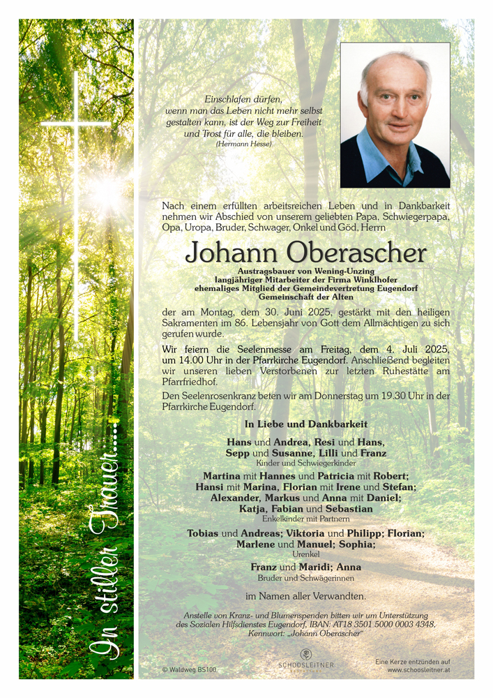Neuer Eintrag in das Kondolenzbuch von Herr Johann Oberascher